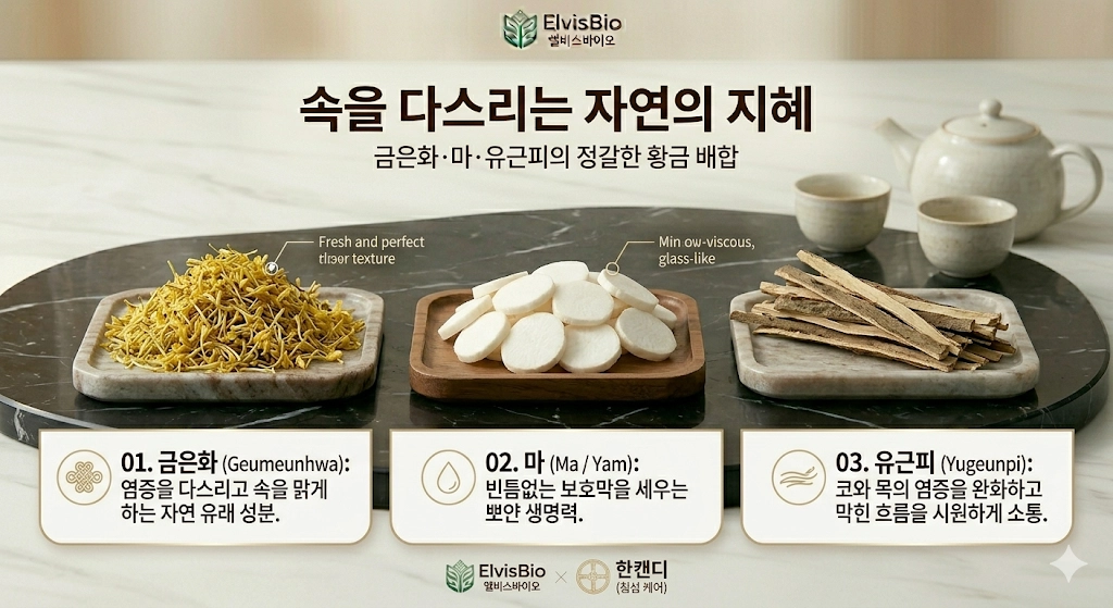 기능: 나복자의 강력한 소화 효소 성분이 탄수화물 분해를 돕고, 생강이 위장을 따뜻하게 하여 소화 운동을 촉진함.